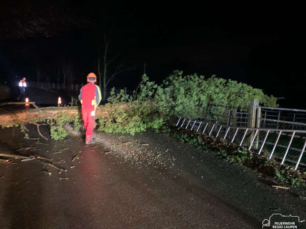 Dieser Fallbaum im Faverwald versperrte die Durchgangsstrasse und konnte mithilfe von vier AdF’s der Kompetenzgruppe entfernt werden.